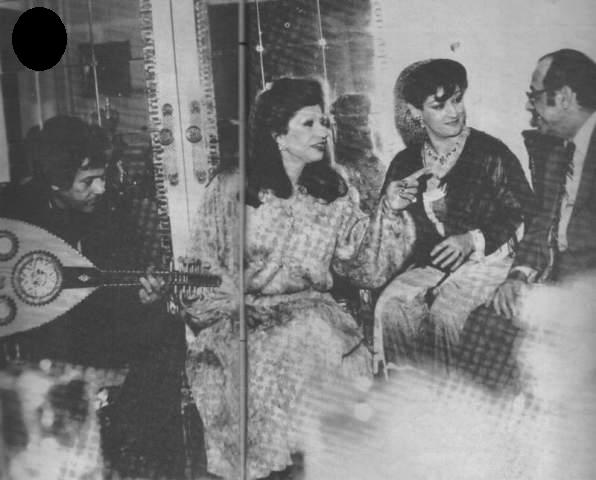 2 مرفق فايزه أحمد صوت الكروان هاني مهني موسيقار أحمد السنباطي زوج أبنة فايزه وأبن رياض السنباطي محسن جابر مدير شركة ( عالم الفن ) أثناء تسجيل آخر عمل لفايزه (( لا ياروح قلبي أنا )) أثناء مرض فايزه بالمرض الخبيث |