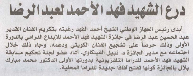 | > ( أرشيف الموسوعة الصحافية ) درع الشهيد فهد الاحمد لعبد الرضا |